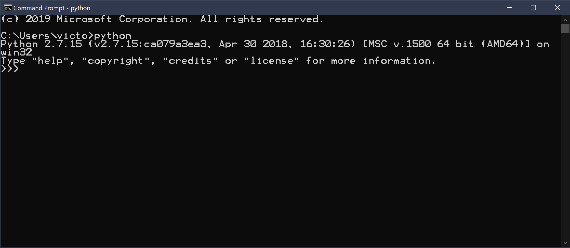 C'est très simple. Ouvrez un terminal (chercher "cmd" sur Windows) et taper la commande "Python". Si vous obtenez une image similaire, l'installation est réussite ! (Notez que votre version peut différer de la mienne)