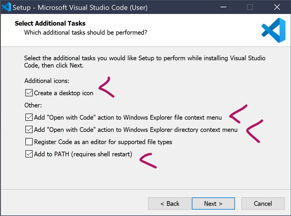 Commencez donc par vous rendre sur le site officiel de Visual Studio Code pour le télécharger. Encore une fois, sur Windows faites bien attention à cocher les cases suivante :