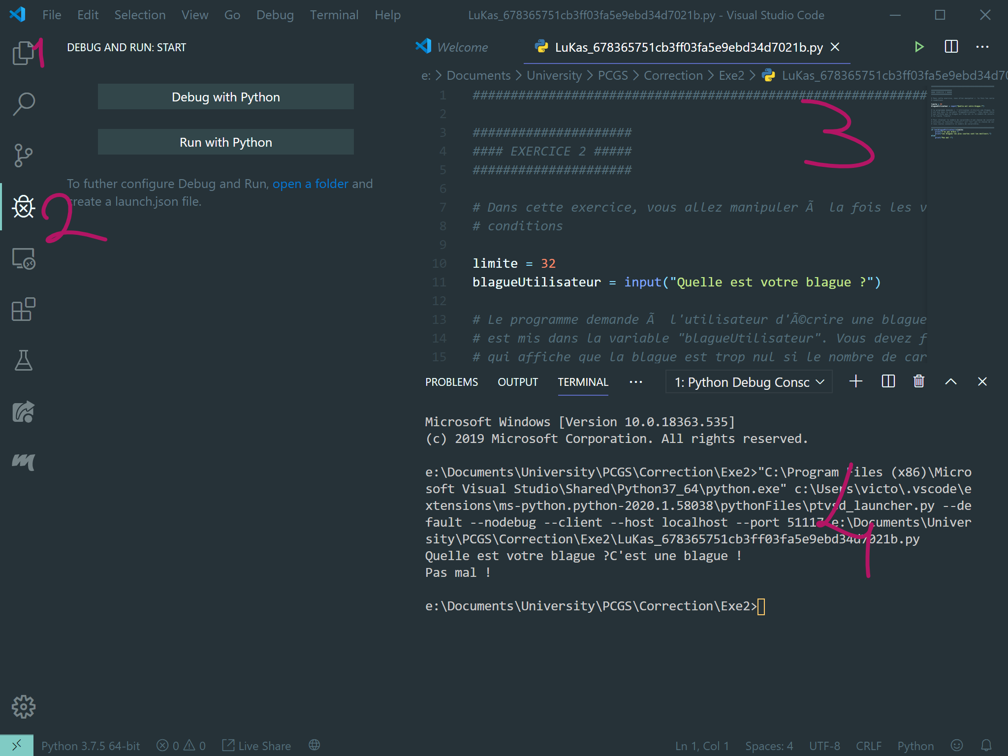 Une fois votre code écrit, vous devez utiliser "Run with Python" pour voir le résultat. Nous verrons en cours ce que c'est que "Debug".