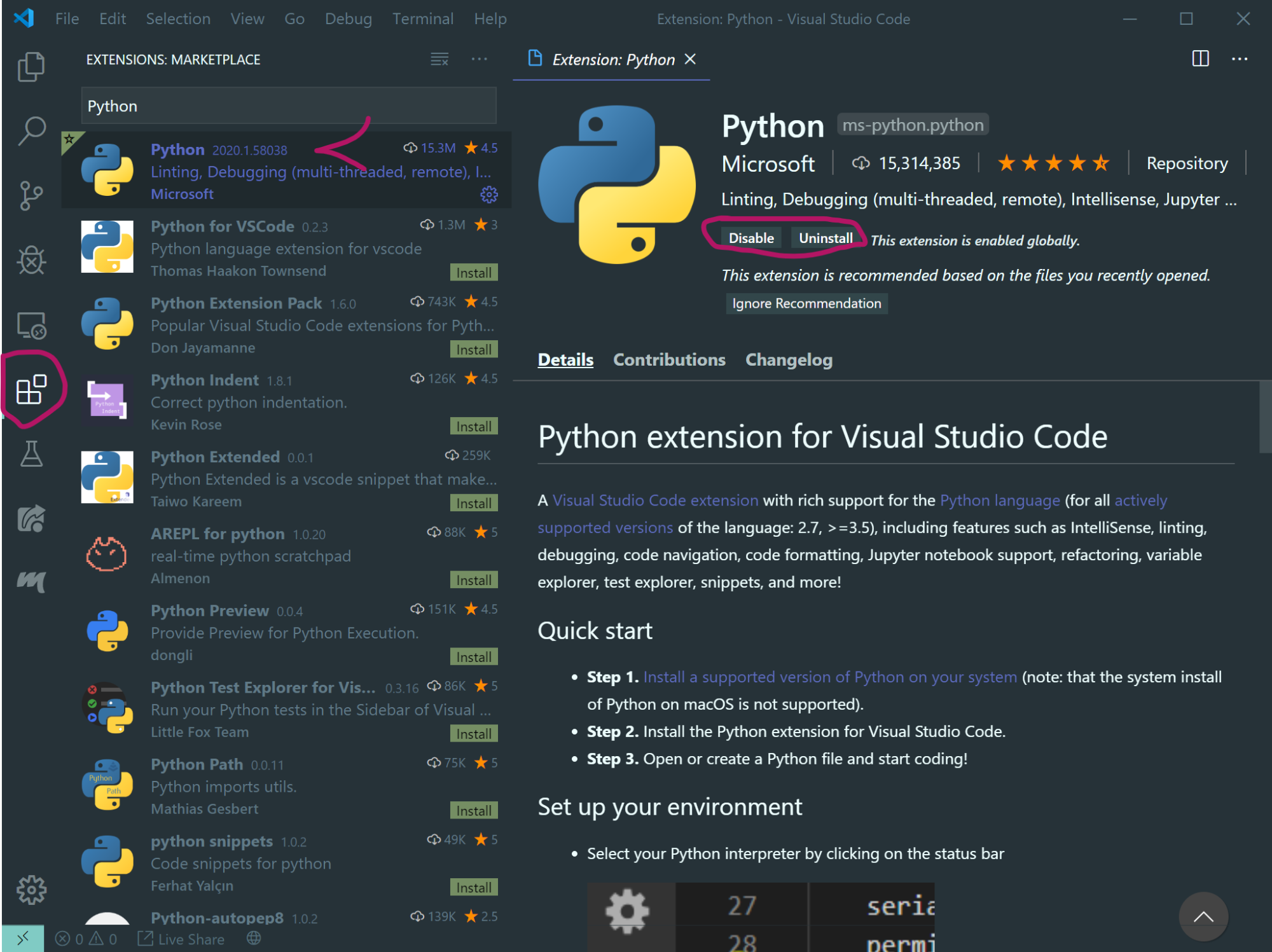 Vous devez maintenant ajouter l'extension Python à Visual Studio Code. Pour cela vous devez vous rendre dans le magasin d'extensions, y chercher Python et installer la première extension. Tout ce résume sur cette image (j'ai plus de boutons que vous, c'est normal !) :